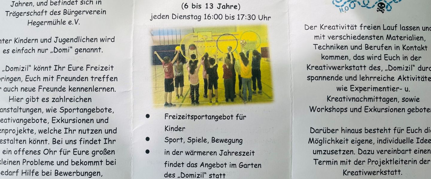 Das „Domizil“ ist ein offener Treffpunkt für Kinder und Jugendliche im Alter von 6 bis 25 Jahren und bietet vielfältige Möglichkeiten der Freizeitgestaltung. Ob Kreativworkshops, Sportangebote, Exkursionen oder Unterstützung bei schulischen und behördlichen Aufgaben — das Team vor Ort schafft einen verlässlichen Raum, in dem junge Menschen Motivation, Orientierung und Gemeinschaft erfahren.